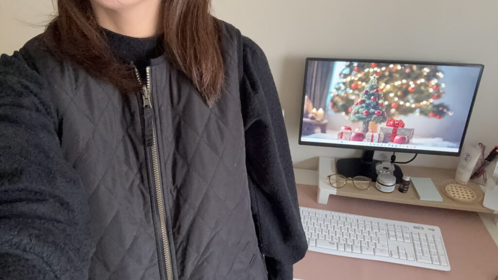しまむらで購入したこのベストがとても温かくて作業しやすいです。フリースなど、家で沢山着こむと袖のところが邪魔になって好きでは無いのですが、こちらはベストなので袖が無くPC作業しやすいです。