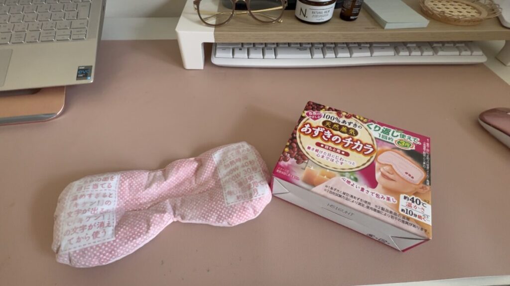 電子レンジで40秒ほど温めて目に乗せて15分ほど目をつむって休憩するだけで頭も目もすっきりします。
