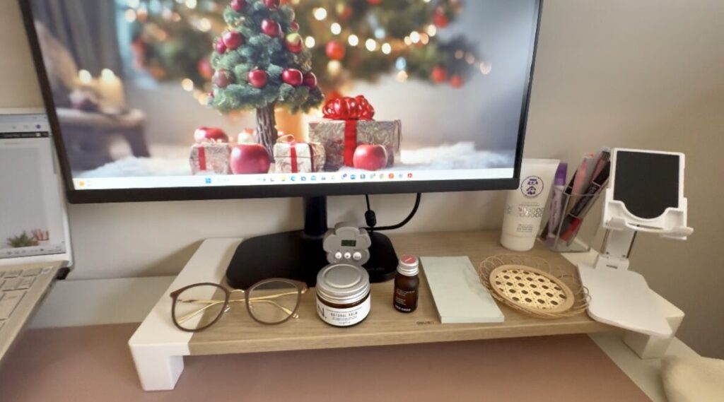 モニター台を使って少し目線を上げることで猫背防止にもなるので、使うことをおすすめします。